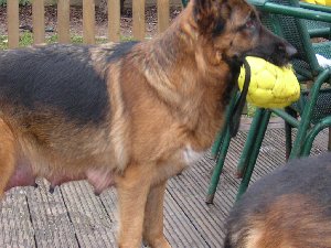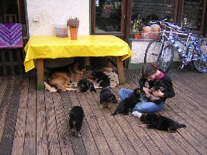 Das war die Höhle von den kleinen Welpen ein Tisch auf der Terasse mit einer Plastik Tischdecke drauf! Dort fühlten sie