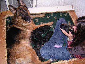 Da sind wir wieder! Alle da und ich sitz mit der Katze in der Wurf-Kiste. Man sieht der Katze an das sie ganz froh ist das alle Welpen draußen sind und sie Jetzt vertig ist!
